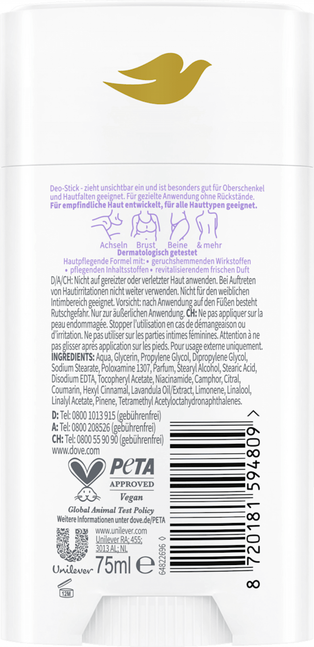 Dove - Desodorante Deostick Whole Body Lavanda e Camomila, 75 ml